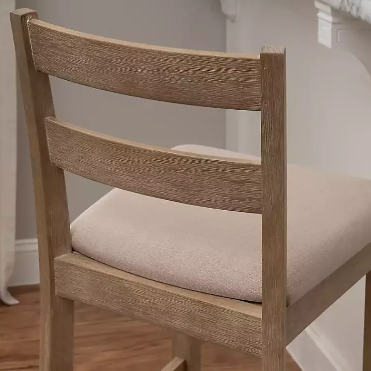 This Rustic Graywash Wood Upholstered Bar Stool features simple yet elegant details, like its ladder back design, rustic finish, and flared legs. Solid wood construction and quality craftsmanship make this a stylish and sturdy seating option for your dining area!