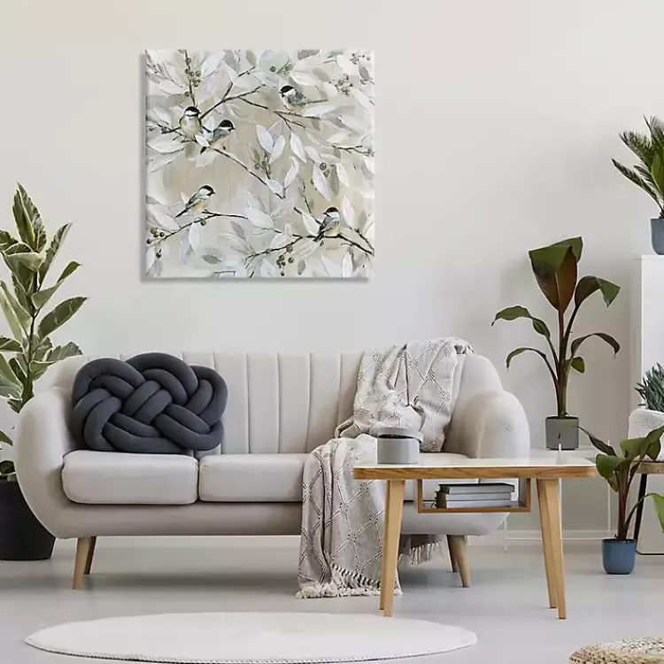 Bring a romantic view of nature into your home with this Chickadee Birds on Branch Canvas Art Print. While it makes a lovely statement, the natural tones will seamlessly blend into your space.