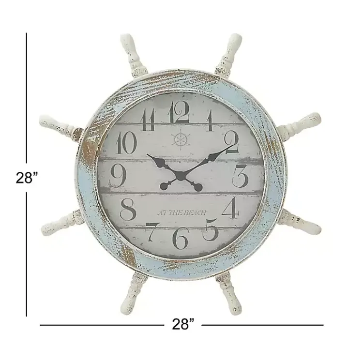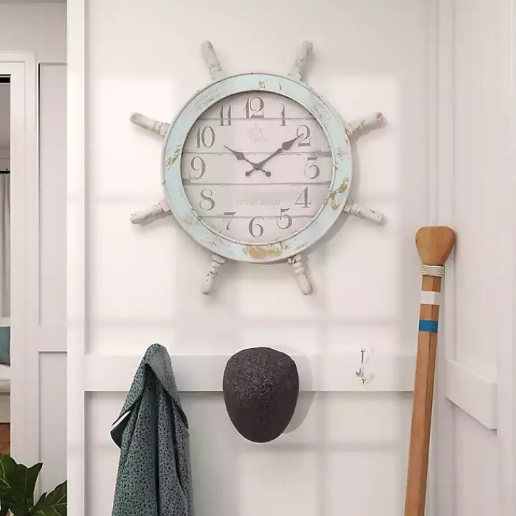 Make sure to set sail on time with this Wood Ship Wheel Wall Clock. Its distressed finish and nautical design will make the perfect addition to your coastal decor!