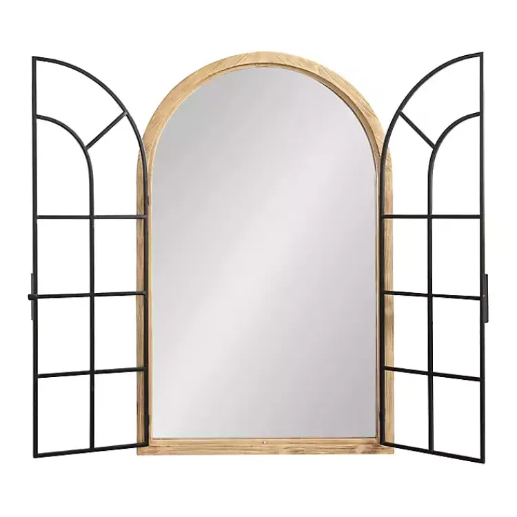 Craft a beautiful farmhouse look in your living space with this Natural Wood and Metal Arch Windowpane Wall Mirror! Inspired by rustic farmhouses, this bold mirror features a window-inspired look with a latched two-door design.