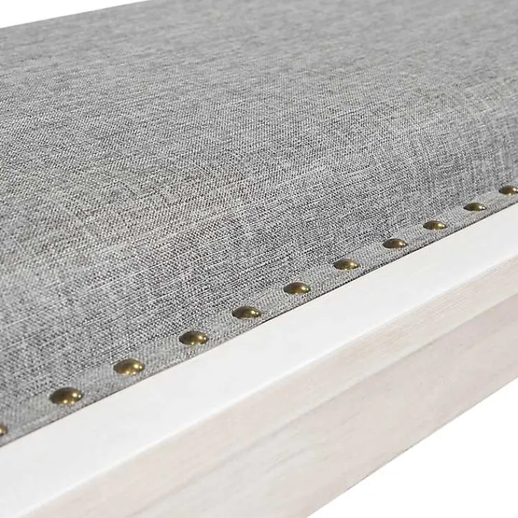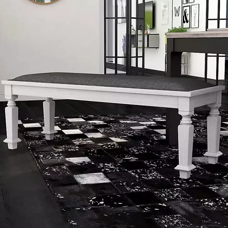 From farmhouse to traditional, this Gray Upholstered Antique White Quin Bench will complement a variety of styles. Enjoy every meal with the comfortable wide cushion and stylish design!