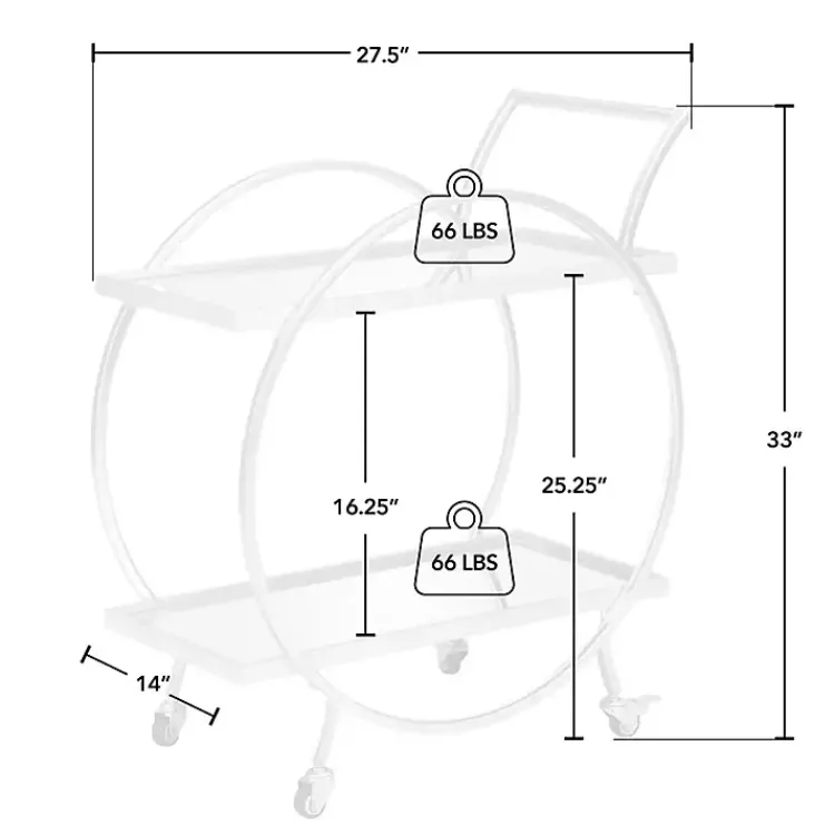 - Bar cart measures 27.5W x 14D x 33H in.