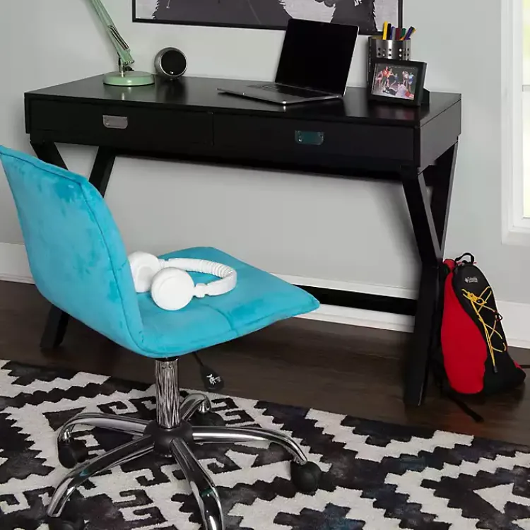 Make work fun with this campaign-style Black Wood 2-Drawer Peggy Desk! The x-framed legs provide a study foundation for your workspace and two drawers provide ample space for supplies.