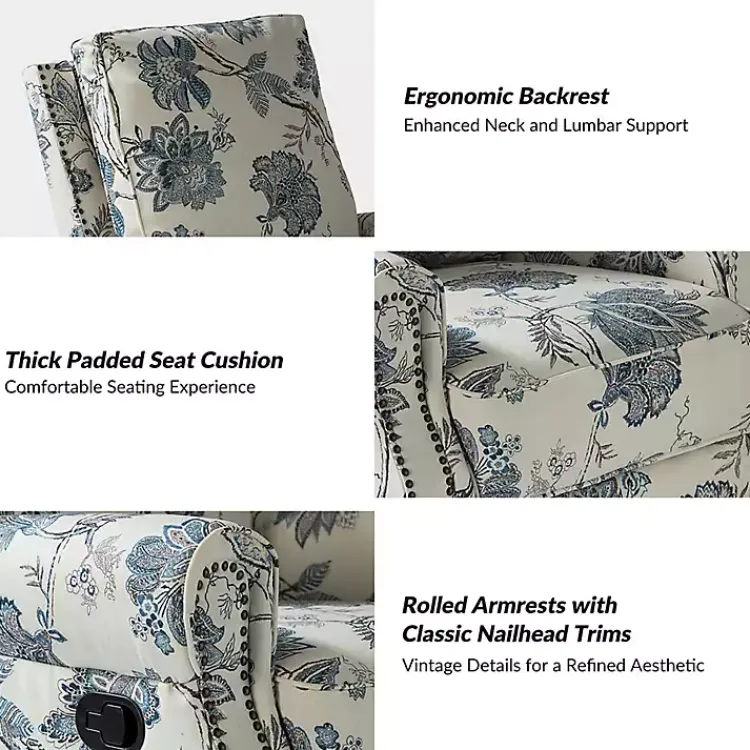 Bring style and comfort to your space with this Cream and Blue Floral Rocking Recliner! The vintage-inspired floral pattern is perfect for bringing an elegant touch to your living room. Comfort is guaranteed with features like swivel capability, reclining mechanism, and rocking ability!