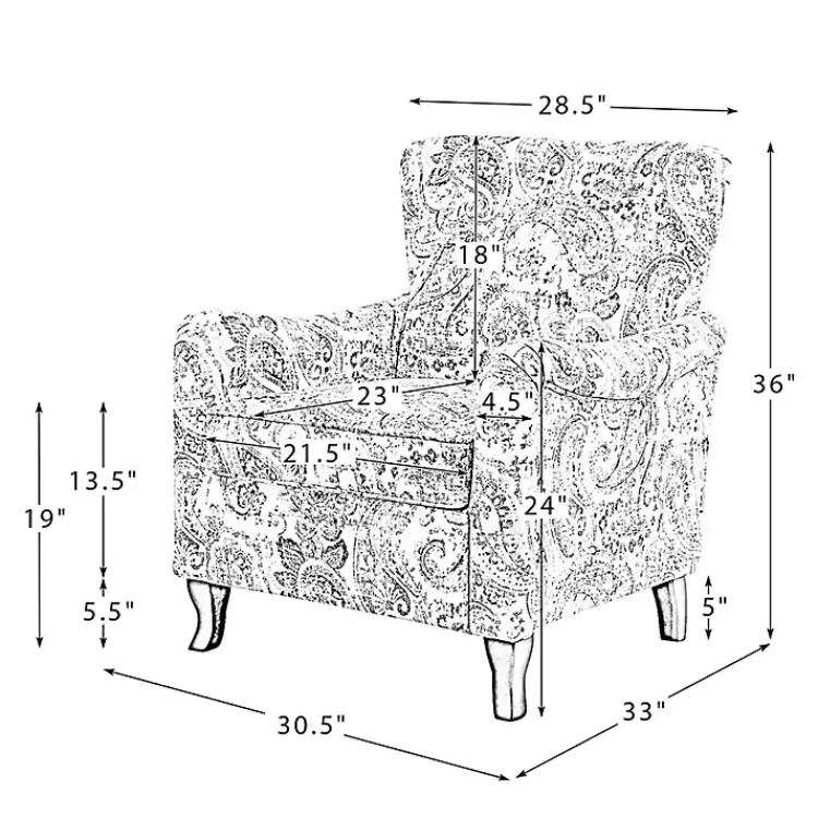 - Chair measures 30.5L x 33W x 36H in.; seat measures 19H in.