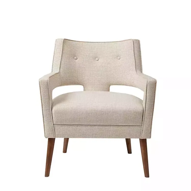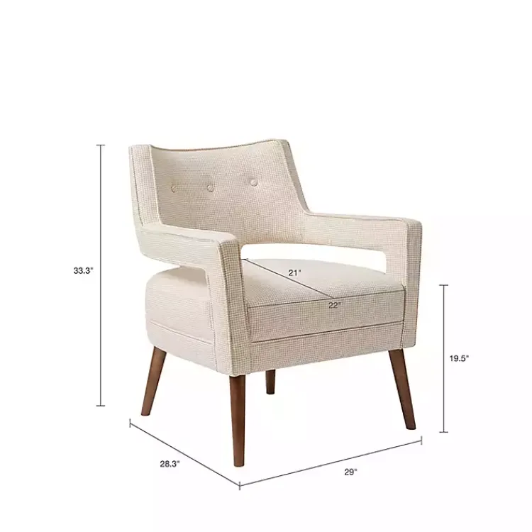 Tapered legs, angular design, and open back accents lend a mid-century modern twist to a classic armchair. The soft color palette and subtle pattern of our Ivory Open Back Mid-Century Modern Armchair make it the perfect chair for any space.