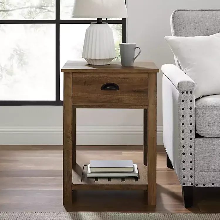 Whether you’re looking to keep things quaint and charming or simply organize your home, this Barnwood Country Accent Table will satisfy your design desires. The single top drawer with a cup handle features telescoping metal drawer glides for convenient closed storage. The lower slat style shelf creates an open storage space while emphasizing farmhouse style. Use this accent table in the living room or home office for some sneaky storage. Pair with the matching entry table to make a complete set in your home!