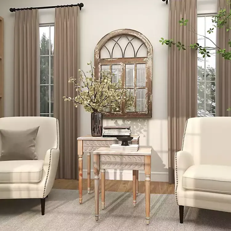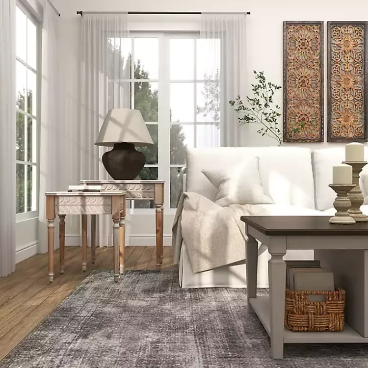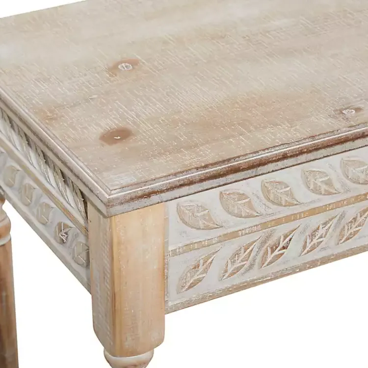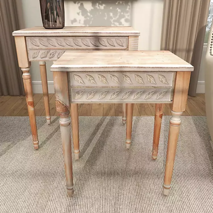 Refresh your living room lounge area with the set of Natural Wood Carved Leaf Accent Tables. Crafted with pillar style legs and a whitewashed finish, these tables embody classic farmhouse beauty.