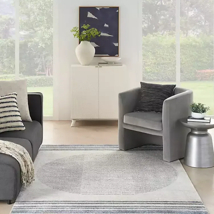 Embellish your floors with some soft color and texture! The modern style of this Blue and Ivory Linear Orb Washable Area Rug will update any room of your home.