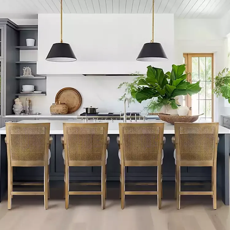Enhance your kitchen with this Ivory Upholstered Cane Backrest Counter Stool! The reclaimed wood finish and caning details add a timeless charm. You’ll love its style and comfort!