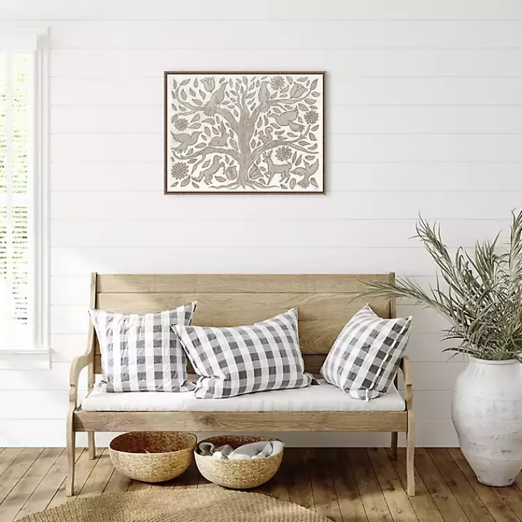 The Animal Tree Canvas Art Print showcases a harmonious blend of nature and wildlife in decorative, folksy style. The beautifully balanced design is softened with neutral hues, and the beaded bronze frame adds a gorgeous finishing touch.