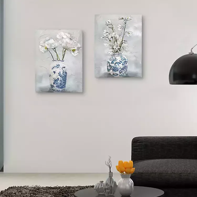 Our set of Chinoiserie I & II Canvas Art Prints feature white florals in vases with unique Chinese imagery. Hang them on white walls for a clean, minimal look.