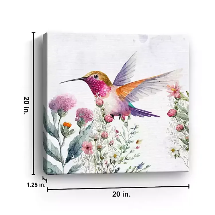 Our Hummingbird Wildflower II Canvas Art Print makes for a charming addition to any wall. This piece features a vibrantly colored feathered friend in flight.