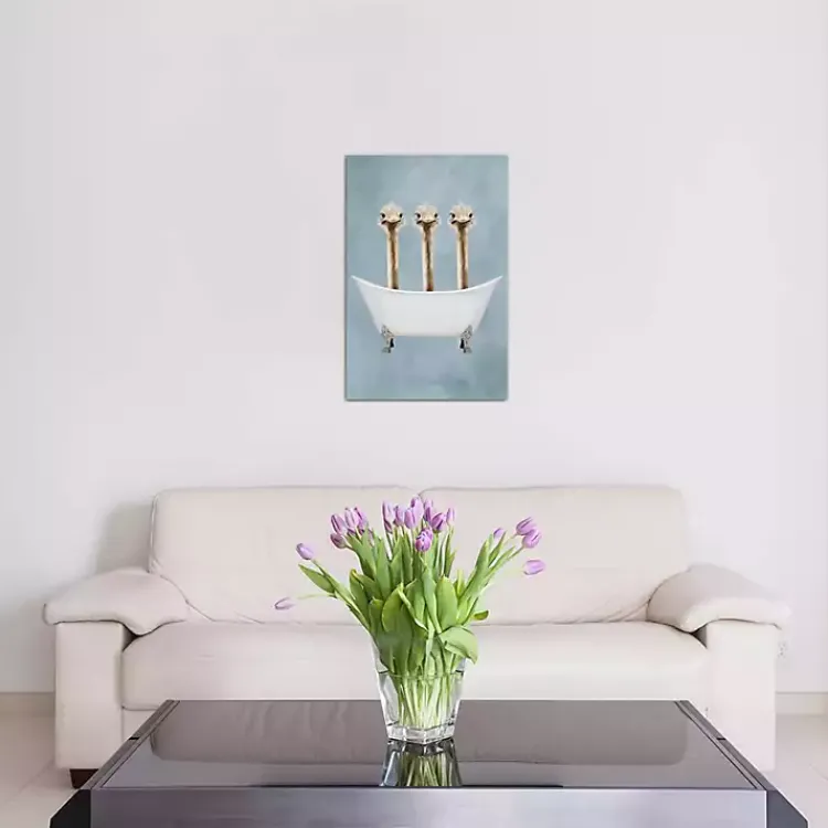 Three cute ostriches are washing up in this unique Ostriches in Bath Tub Canvas Art Print. It adds a whimsical touch int…