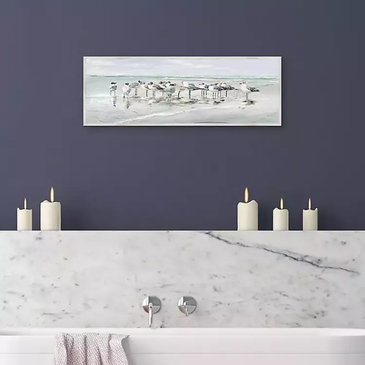 Evoke the beauty of seaside life in your home with the Seagull Gathering Framed Canvas Art Print. The flock of seagulls will be a lovely addition to your coastal collection!