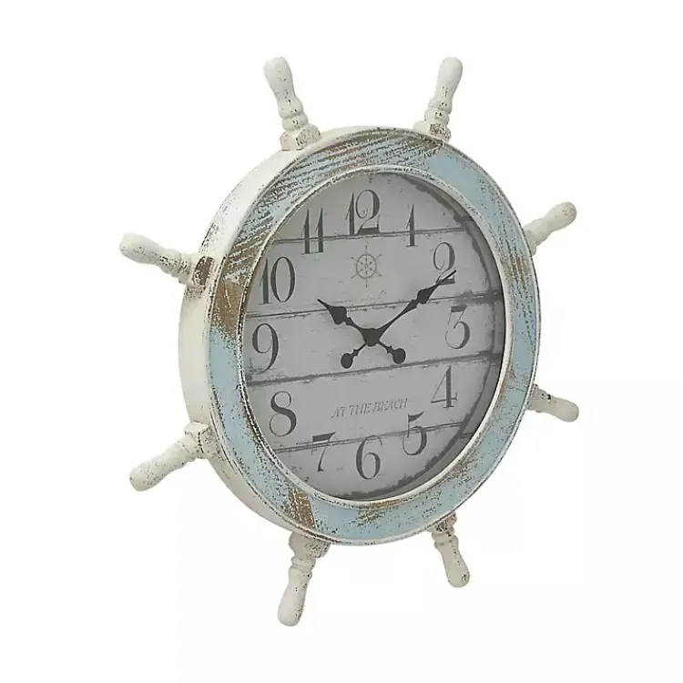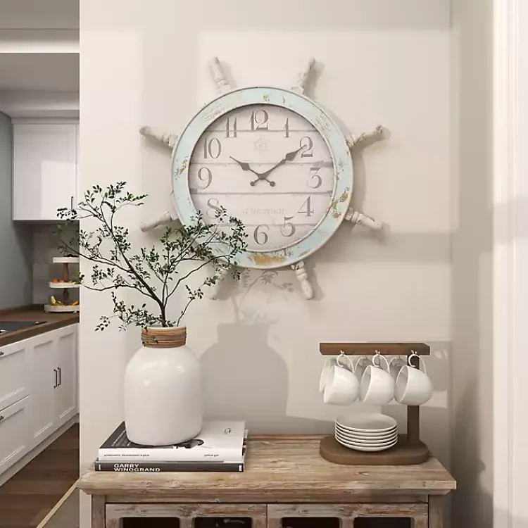 Make sure to set sail on time with this Wood Ship Wheel Wall Clock. Its distressed finish and nautical design will make the perfect addition to your coastal decor!