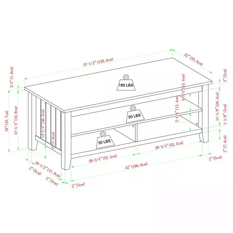 - Table measures 47.5L x 22W x 18H in.