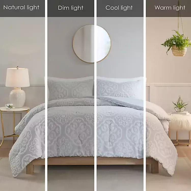 This shabby chic Madison Park Maeve 3-pc. Full/Queen Comforter Set features a tufted medallion pattern on top of tightly woven threads, giving it texture and dimension!