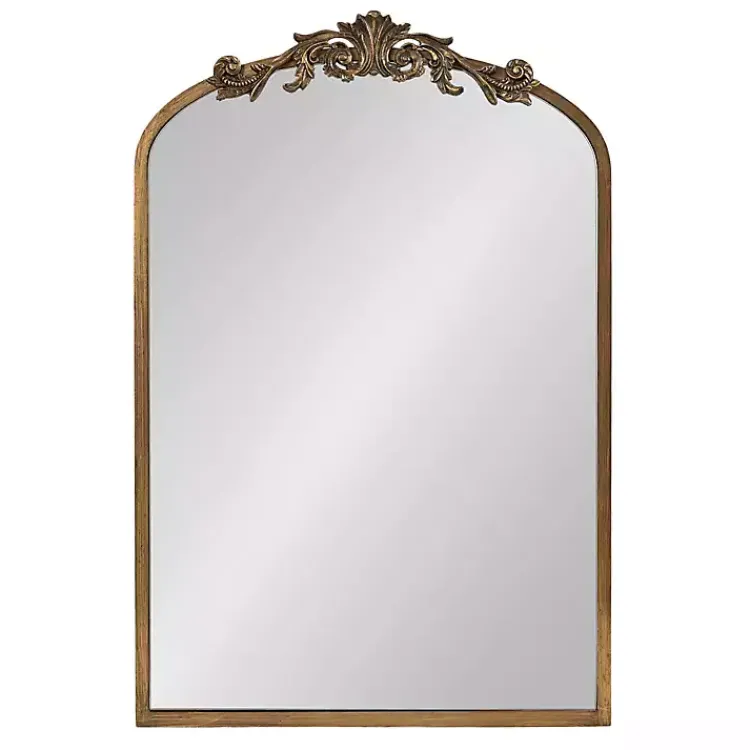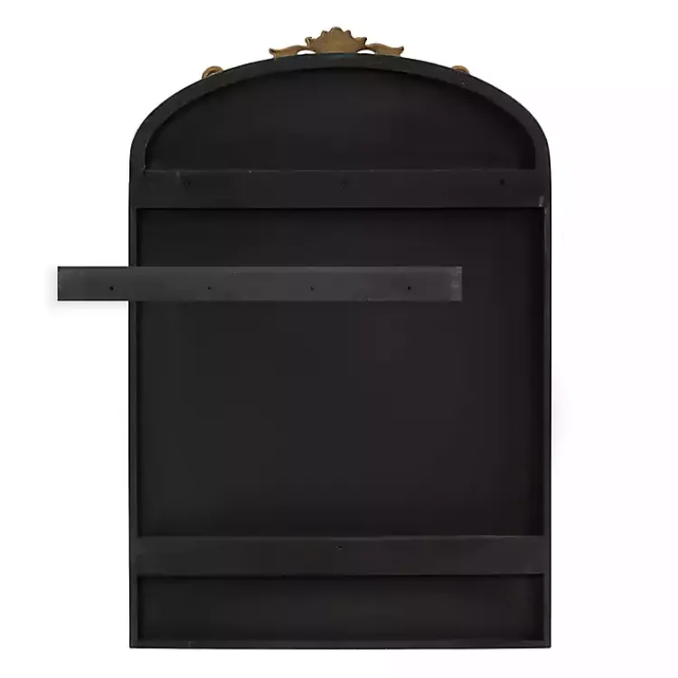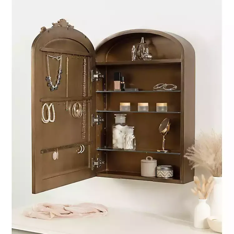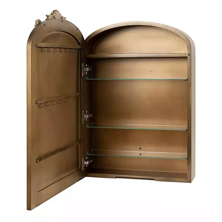 The Gold Arendahl Arched Mirror Jewelry Cabinet features a stunning arched cabinet design that is meticulously crafted to cater to your storage needs while adorning your space with its sleek design. Inside, discover ample storage for your treasured belongings.