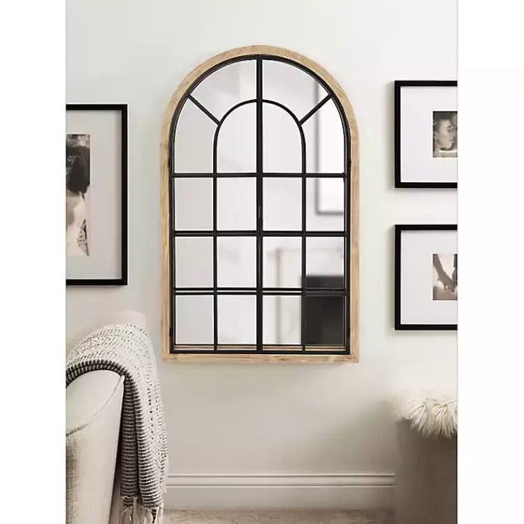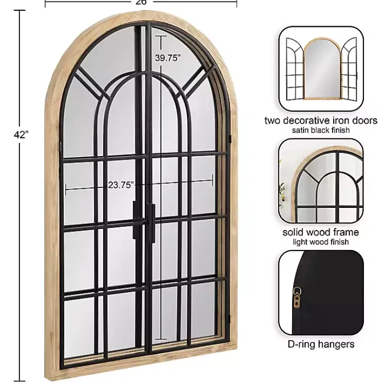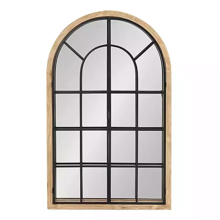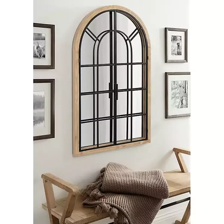 Craft a beautiful farmhouse look in your living space with this Natural Wood and Metal Arch Windowpane Wall Mirror! Inspired by rustic farmhouses, this bold mirror features a window-inspired look with a latched two-door design.