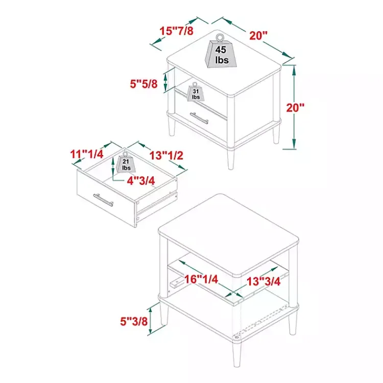 - Nightstand measures 20L x 15.9W x 20H in.