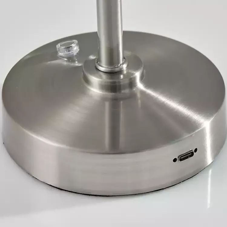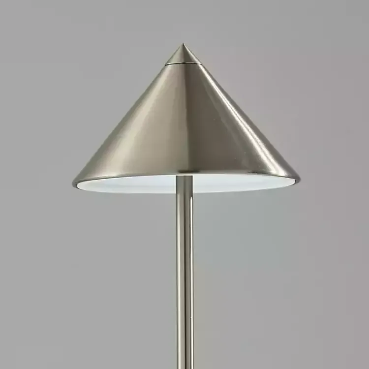 Give your space a modern touch wherever you go with this Silver Metal Cone Shade Cordless Table Lamp! Featuring a rechargeable light and protection against outdoor elements, this stylish lamp can illuminate your office, bedroom, porch, or patio!