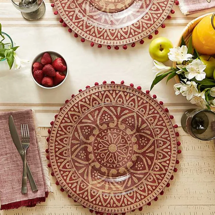 Add a unique, decorative touch to your dining table with these Red and Natural Print Round Placemats. You’ll love their detailed print and fun, pom fringe.