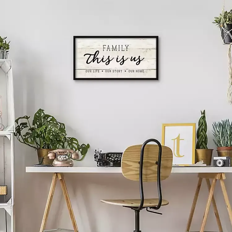 - Features the phrase “Family This Is Us Our Life Our Home Our Story” in black lettering